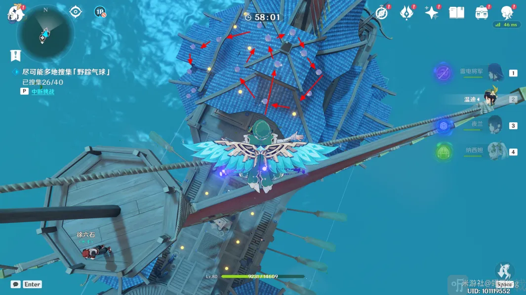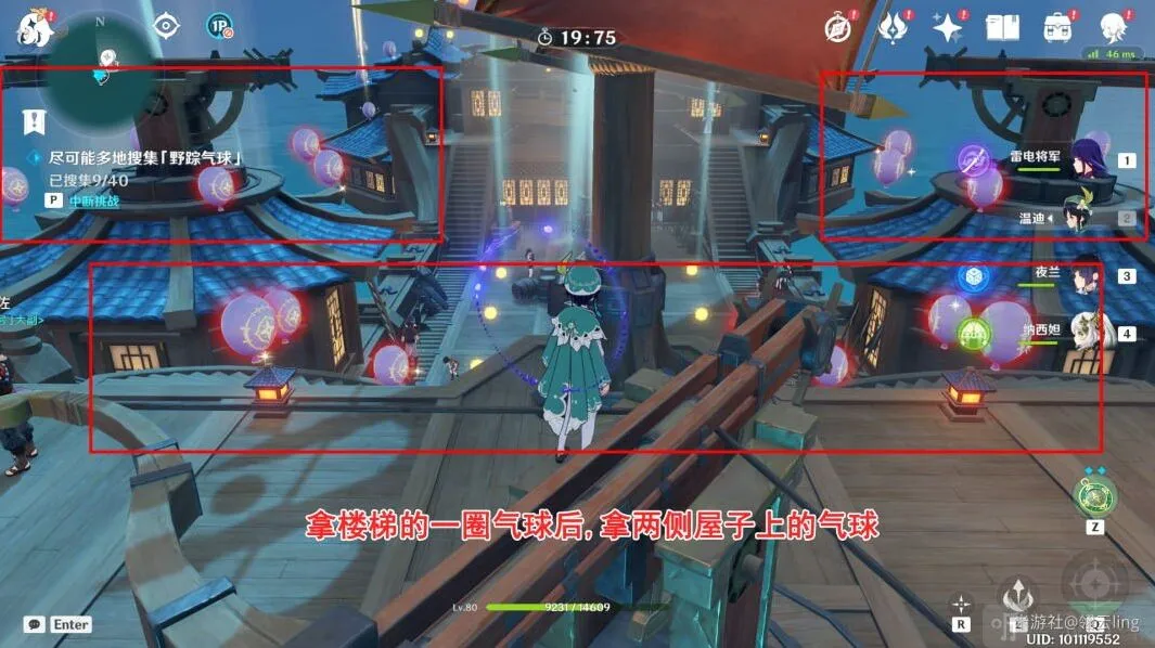 6.向下看,看到屋子上的两层气球和左侧的几个气球,从上到下一一拾取,40个气球拾取完成