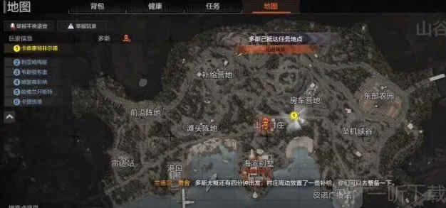 进入游戏后,打开游戏地图,可以看到多斯一开始是在山谷村庄的,可以给个标记然后跑过去汇合。到了村庄后可以先开始摸子弹箱和手雷箱。