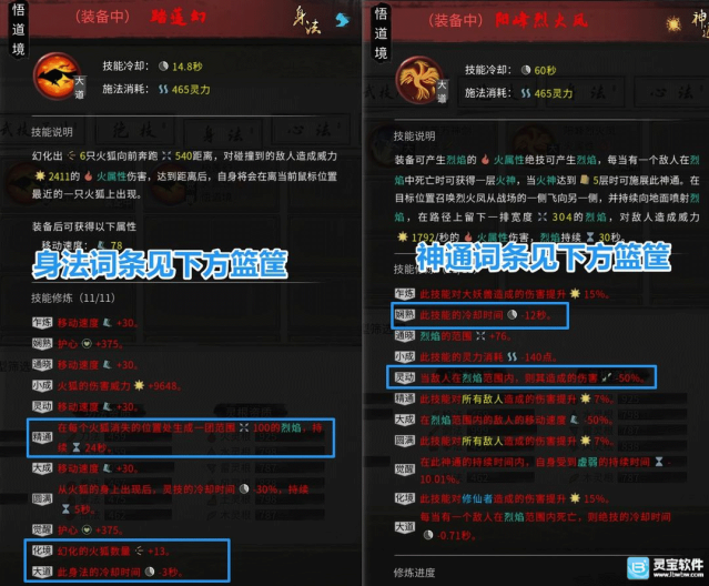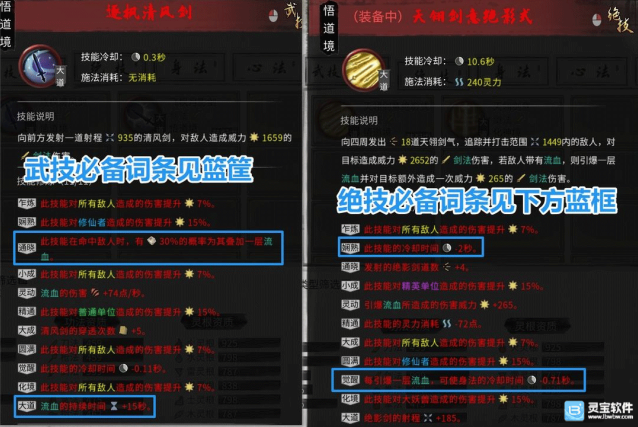 (2)图中标注的关键词条中,其中:引爆流血,减低身法CD时必须有的!