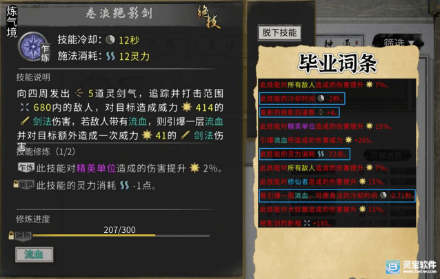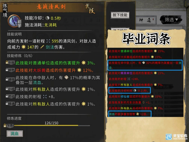 2、绝技狂血斩/狂刀:引爆血刃-武技冷却30%、冷却-3S、只有1个敌人-武技冷却、吸血、伤害增加