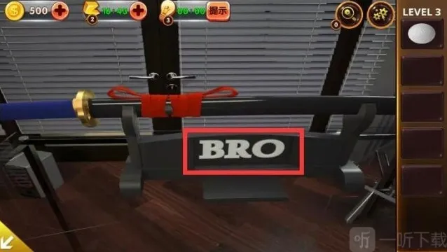4、将剑和剑套相结合后,点击沙发背后,将剑放入架子上,得到提示:“BRO”。