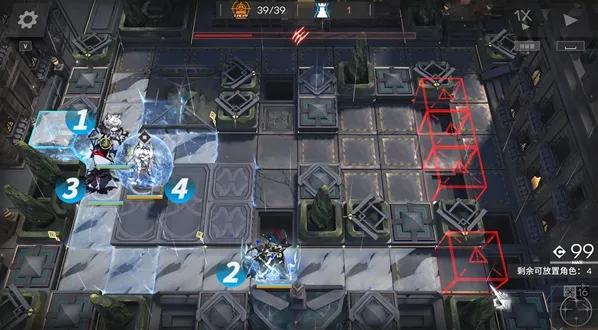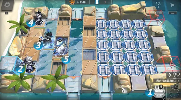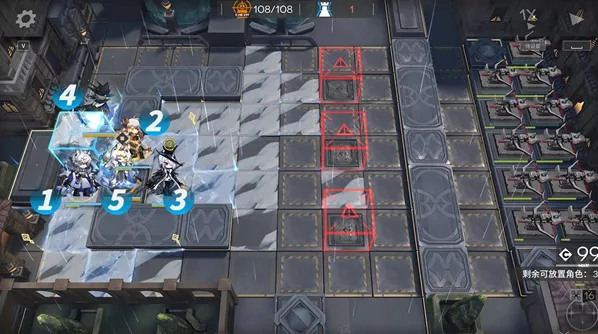 2、CG-2:角色同第一关,部署方向为凛御银灰向右,格蕾蒂娅、乌尔比安、圣聆初雪向下,部署位置和顺序如图所示。