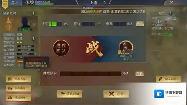 城池驻守需要派出部队驻守城池不强制需要5将,驻守武将不能移动,但会消耗一定的体力,对战是会得到一定的战功,功勋。