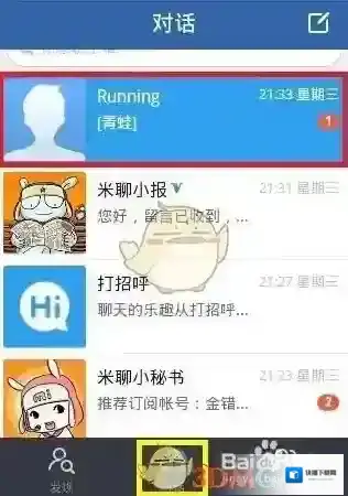 打开手机“米聊”程序,切换至“对话”选项卡,常按要删除的聊天记录。