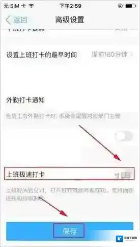 3、然后下滑找到上班极速打卡点击旁边按钮,再点击保存即可。