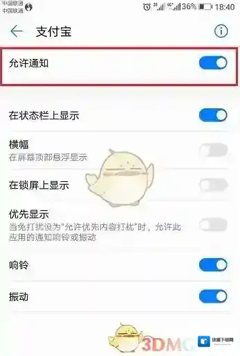 进去之后,将允许通知开启,这样支付宝应用就可以接收转账、还款等系统通知了,如下图所示: