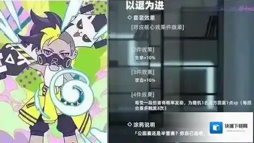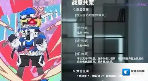 战意共荣:每次友方行动后,自身攻击力提高,持续到自身 释放技能或受到伤害后结束,最高叠加6层。这个套装三保 一单C (单输出)队也能用。