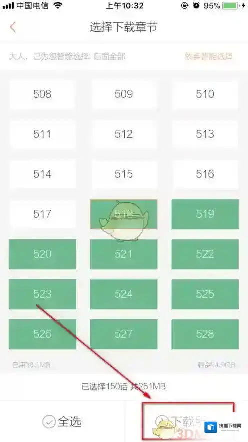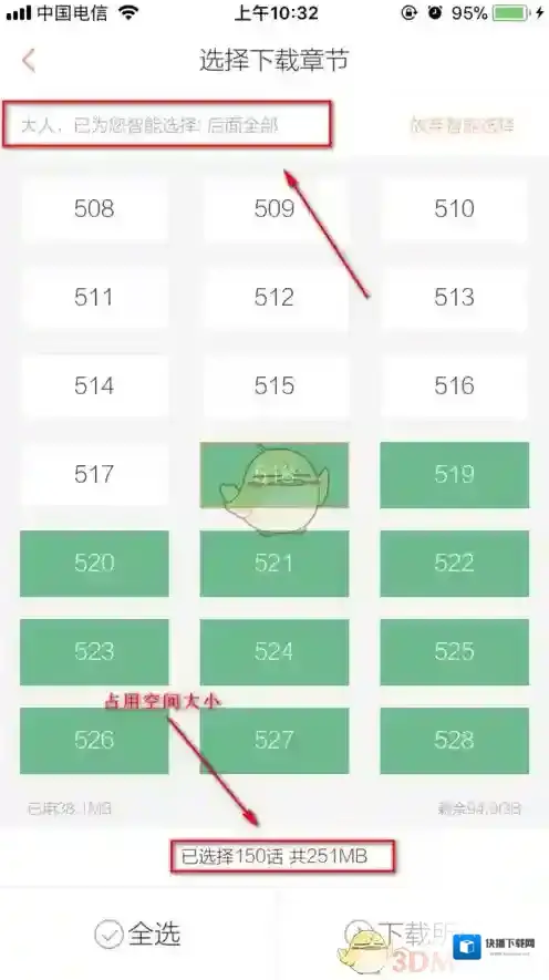 4、然后软件会自动全选你没有看过的漫画集数,并且在下方显示所需要占用的空间