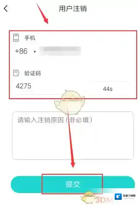5、在用户注销界面中输入注册该账号的手机号码以及收到的验证码,提交,确定注销即可