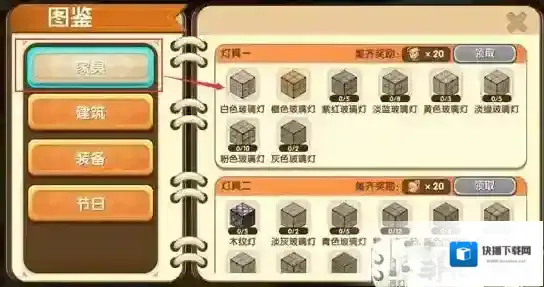 在图鉴里面找到家具一栏,就能找到淡蓝玻璃灯。