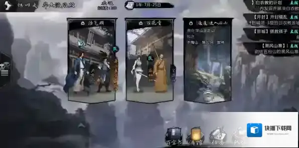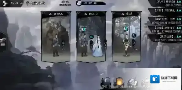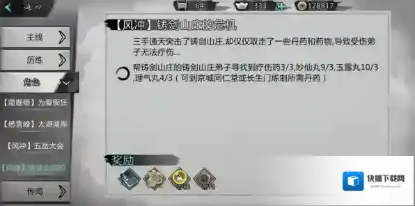 分支任务:先后去恒山长生门、泰山铸剑山庄。铸剑山庄弟子要的药在恒山炼丹炉炼。再依次去恒山,黑月崖而后岳黛颖自爆三手通天身份,
