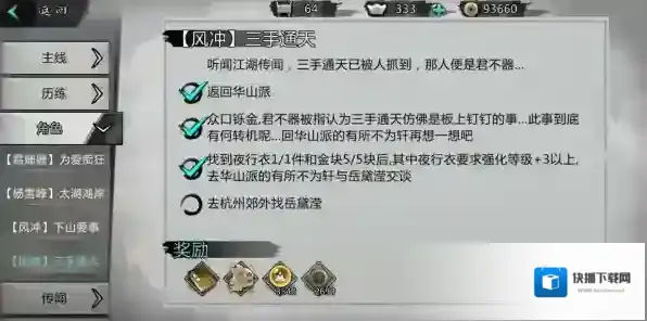 5,在华山和岳mm对话,准备去杭州冒充三手通天,帮君不器洗脱罪名。准备夜行衣+3(杭州本杰明处购买),金块5个。