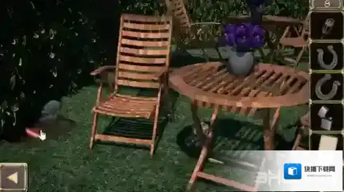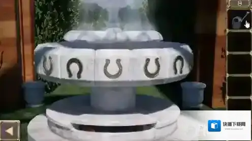 点击中间的喷泉,放上马蹄铁根据储物室门上的提示调整,打开盖子;