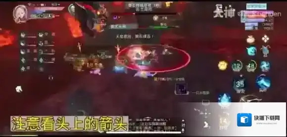 地面中间出现八个红圈,分别带有各个方向的箭头指示,会按照先后顺序一个个朝箭头方向陆续爆炸至地图边缘。需尽量闪开躲避,在不能及时加血的情况下,玩家最多只能承受一个红圈的伤害。