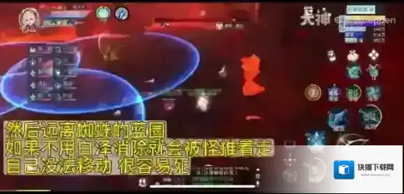 面对这个技能需要人手一只白泽宝宝,当角色头上出现红色箭头时,玩家将会被操控顺着箭头方向直走。此时迅速调出白泽,用手动技能消除状态,然后再往外走,远离三个蜘蛛蓝圈。