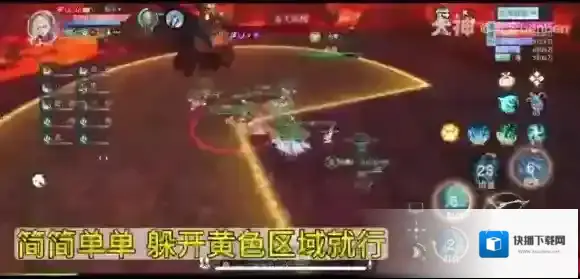 BOSS施放技能,出现不规则的扇形光圈,玩家及时跑出黄色区域即可。