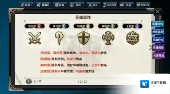 英雄属性分为攻击型、魔法型、防御型、辅助型、全能型五种属性。不同属性的英雄拥有不同方面的特长能力。