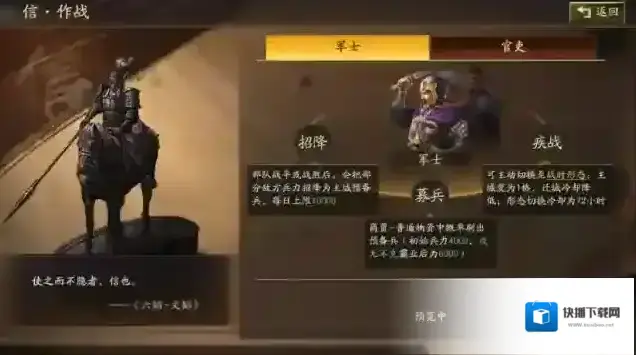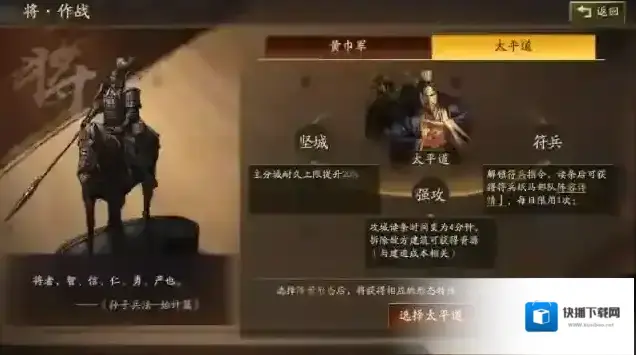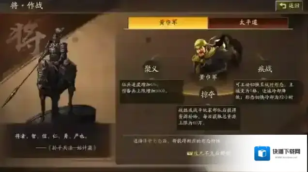 开启时间:解锁霸业进度“攻无不克”后可开启“作战”。汉室和黄巾都有两个选项,汉室可选军士,官吏;黄巾可选黄巾军,太平道。两个选项只能选其中一个,选后不能更改。