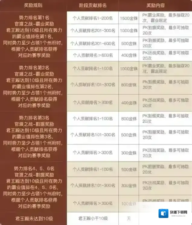 2.赛季末结算时,处于霸业值排行第一的势力且势力贡献排名为201~600的主公玩家将获得割据奖励,600名以后的主公只能获得历战奖励。