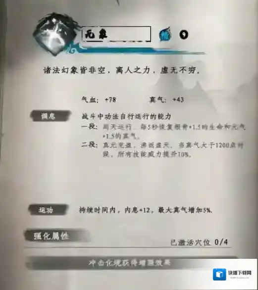 第六部无相心法,该秘籍的获得位点为(1540,1274),玩家在用功的时候可在持续时间内,增加内息12,最大真气增加5%。