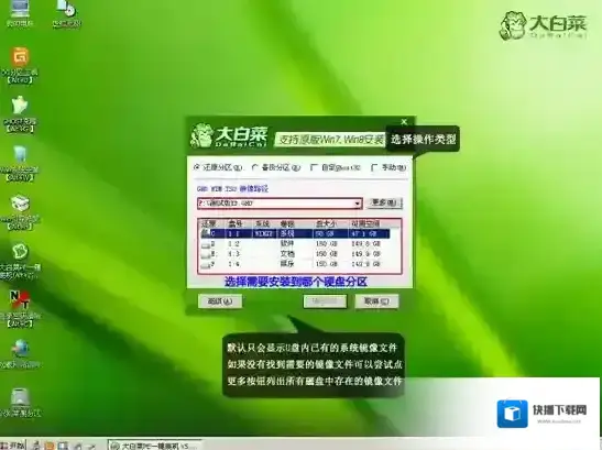 3、进入PE后运行大白菜一键装机工具,然后选择你要安装的系统GHO,再选中你要安装的分区,大多为C盘。