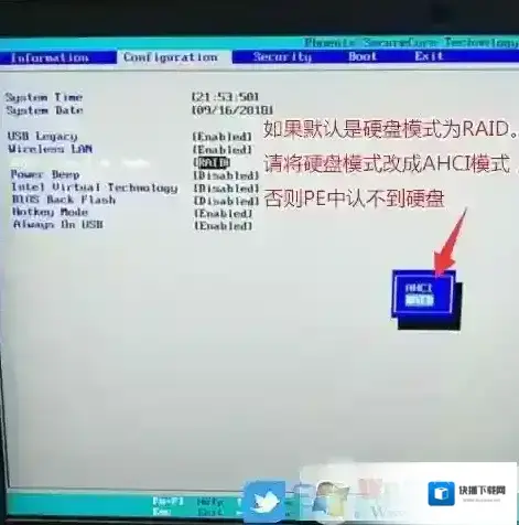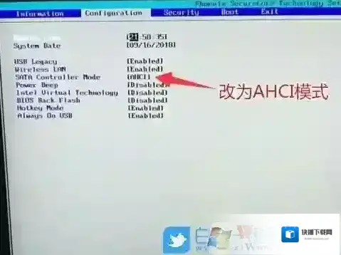 PS:改Legacy传统模式后,注意还要将硬盘分区格式改成MBR6、注意:再返回Configuration项,查看SATA Controller Mode项,如果默认硬盘模式为RAID,请将硬盘模式改为AHCI模式,否则进PE后不能认出硬盘,更改后记得按F10保存;