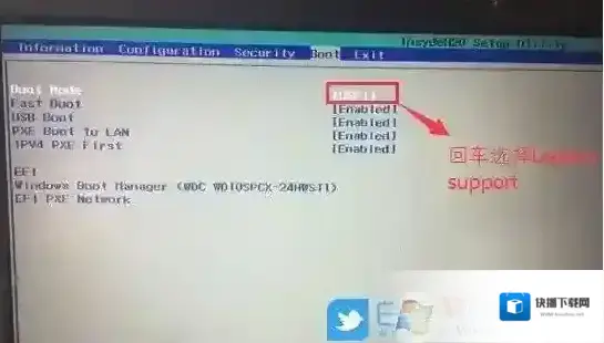 4、切换到Boot选项,把Boot Mode从UEFI改成Legacy Support传统引导,当然不改也可以直接采用UEFI安装(这个看大家的选择吧,目前新电脑最好使用UEFI+GPT);