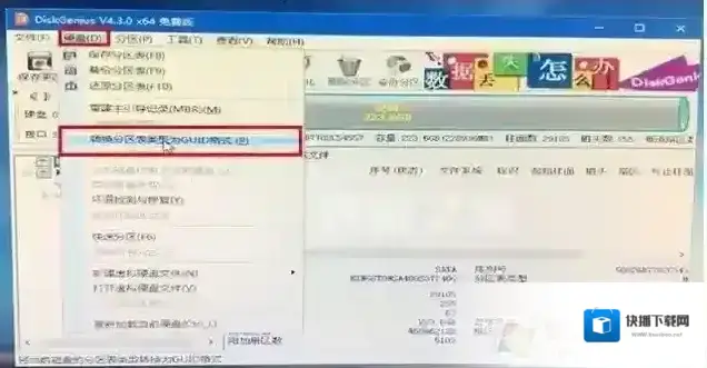 2、点击分区工具最上方的“硬盘”选项卡,弹出菜单之后点击“转换分区表类型为GUID格式”,如下图所示。