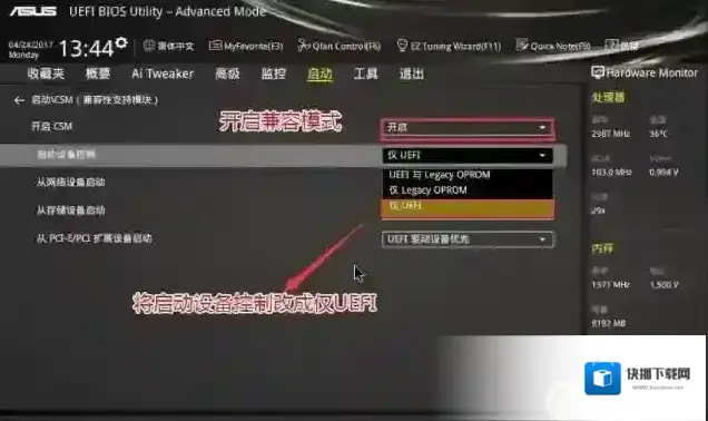 4、进入后开启兼容模式和uefi引导,这里比较重要,如果是m.2固态硬盘,这里一定要采用uefi模式并且分区类型要改成gpt(guid)分区,然后按F10保存设置;