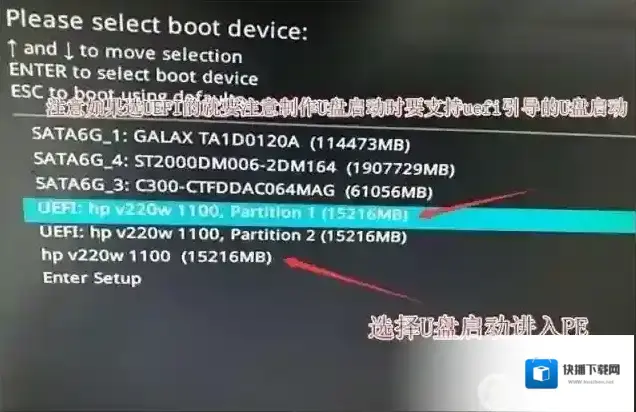 5、把刚制作好的U盘启动盘插入到机器上,重启按ESC选择识别到U盘启动项,回车;