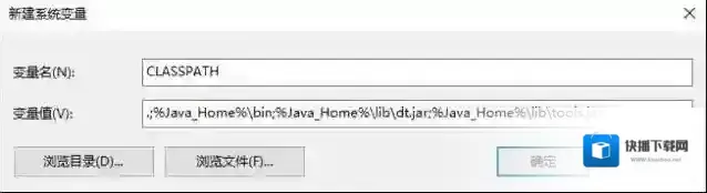 8、接着回到“系统变量”栏,“新建”,“变量名”为“CLASSPATH”,“变量值”为“.;%Java_Home%bin;%Java_Home%libdt.jar;%Java_Home%libtools.jar”,“确定”
