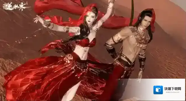 女款外观露染芙蕖,就以夏日荷花为灵感,微雨过,小荷翻,榴花开欲燃。设计上大胆采用了荷花的粉绿配色,荷叶罗裙一色裁出,藕花珠缀,风送馨香,清新自然的同时,又带着一丝西湖的烟雨的味道。男款外观露染菡萏,则描绘了一幅月下莲塘的景色。水榭风微,明月当空,月光倾斜下来,水色变成玉色,点缀于少侠衣间。——————————分割线——————————如果说小荷花外观代表的是江南的夏日,那么接下来要给各位同门介绍的这款外观,则更像塞北的夏日:舞乐浮烬(男)&舞乐火霓(女)灼热、奔放、似火焰、似骄阳。浮烬随风乐清狂,火霓天舞降神晖。舞乐系列时装,伴随着大漠的驼铃,塞北的风声,来到了同门们面前。
