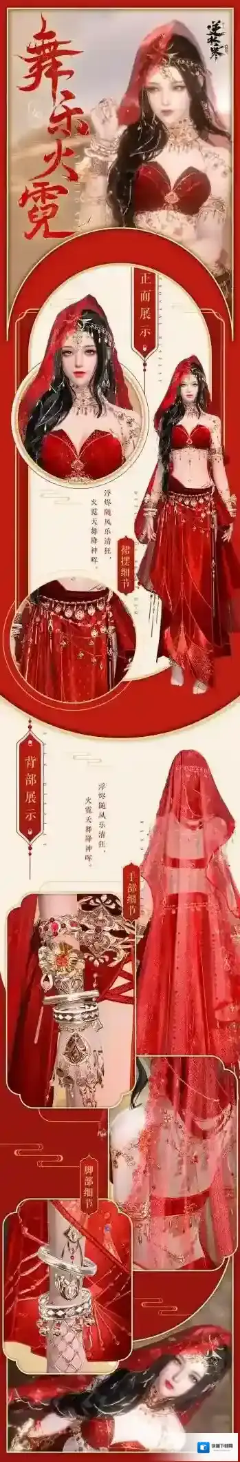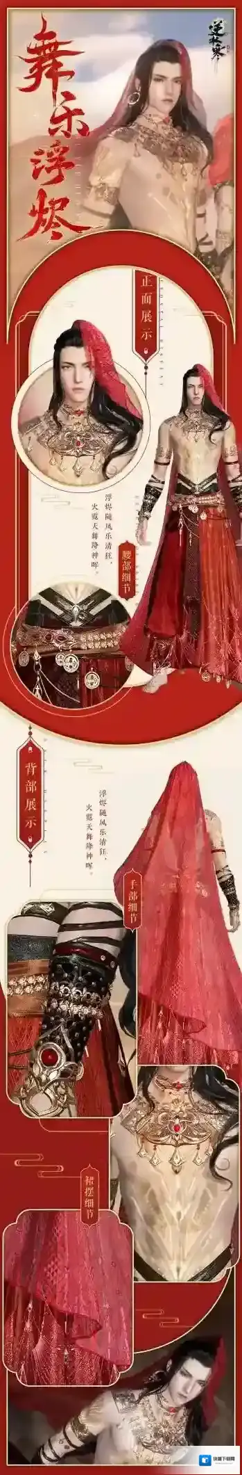 男款外观•舞乐浮烬飘逸的头纱遮掩住了她绝色的容颜,衣间的铃铛平添几分异域的灵动,火红的舞衣宛若骄阳般灿烂,红宝石点缀于金链间,熠熠生辉–