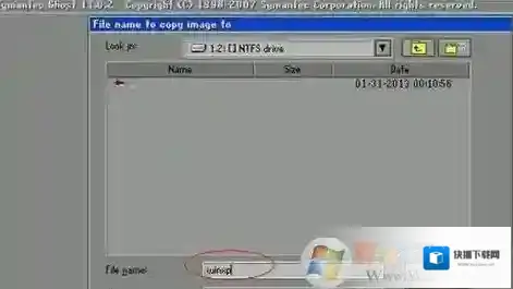 6、选择要存放备份文件的位置和文件名称,位置是在顶部的1:2 [ ] NTFS drive 的位置进行选择分区,然后在框中选择需要备份的文件夹,如果备份在根目录那就不用选择文件夹了,然后直接在flie name 位置输入文件名,最后点击 save ;