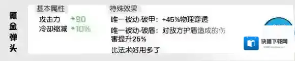 点评:氪金弹头作为穿透类的装备,它的被动能提供45%的物理穿透,而它的另一个被动破盾,则是在对手有护盾的情况下能提高伤害25%,这也就意味着装备了这件装备,想要破盾就会容易很多。而太白想要击杀肉盾英雄也会更加容易。