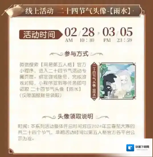 此外,雨水线上活动将于2月28日10时30分至3月5日24时在“网易第五人格”官方小程序二十四节气活动专属页面内开展,访客们在完成绑定游戏账号、完成游戏对局,小程序签到等任务后即可领取二十四节气头像-雨水。画面中,蜡像师正在绿意盎然的户外享受着融融春意,在温柔之春的拥抱之下,可以感觉到寒冷离开后的舒适。