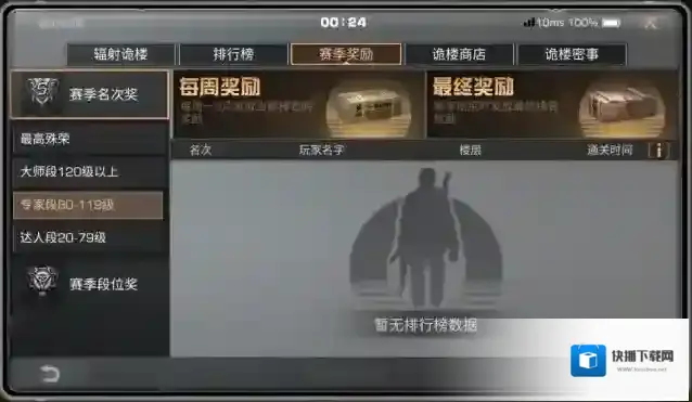 赛季段位奖励在辐射诡楼开启期间段位排行榜将实时更新到赛季结束每个段位有人数上限段位奖励分为实时奖励和每周奖励每周日24:00为结算节点并且赛季结束时还将获得赛季结算各段位奖励