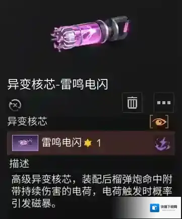 全新榴弹炮异变核芯-雷鸣电闪装配后榴弹炮命中时会对命中目标附加持续5秒的电荷效果每秒造成2%的伤害明日通行证奖励