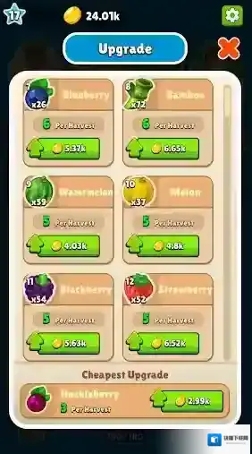 6、游戏的整体玩法就是根据上方的觉得所需要的水果,然后进行种植回收,直至完成任务获得金币。