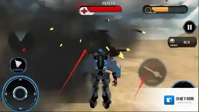 2、遭遇都市巷战,操控改装后的重装战机,在变形为机器人后,用电磁炮摧毁敌军地面要塞。