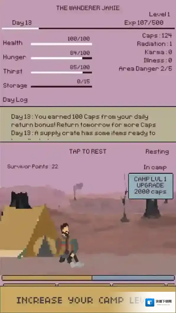 3、在营地,点击休息到第二天,恢复状态,推进Day1进程,积累Survivor-Points,发展角色。