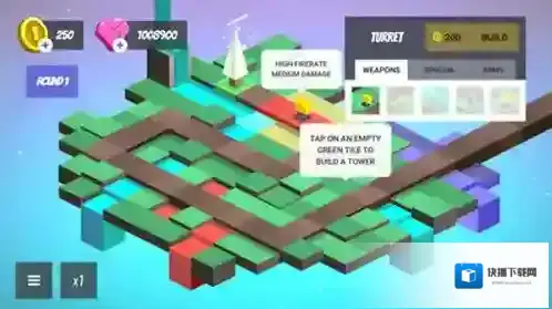 1、点击【BEGIN-ROUND】前,用金币在绿色空地建【TURRET】,布置防御塔迎敌。