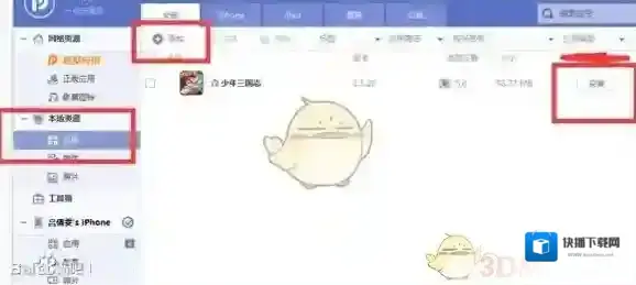 6、三个插件安装完成后,可到光环游戏网盘中下载光环版本Ipa包安装就行,使用电脑上的PP助手可以直接安装客户端,具体步奏为先连上手机,在本地资源-应用-添加-选择网盘所下载的ipa包-安装;