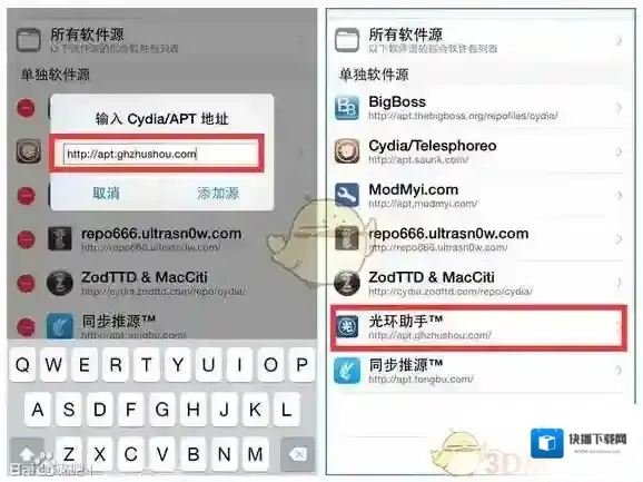 5、添加光环助手源 apt.ghzhushou.com 里面可以下载到针对高版本iOS系统的补丁 光环助手iOS版的都将使用这个源,大家可根据情况安装;